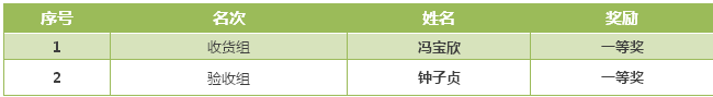 经过评审团的严格审核,比赛共评出一等奖2名,两名获胜者验收和收货完全正确且速度均排名前二,是所有验收组员工值得学习的榜样。获奖名单如下: